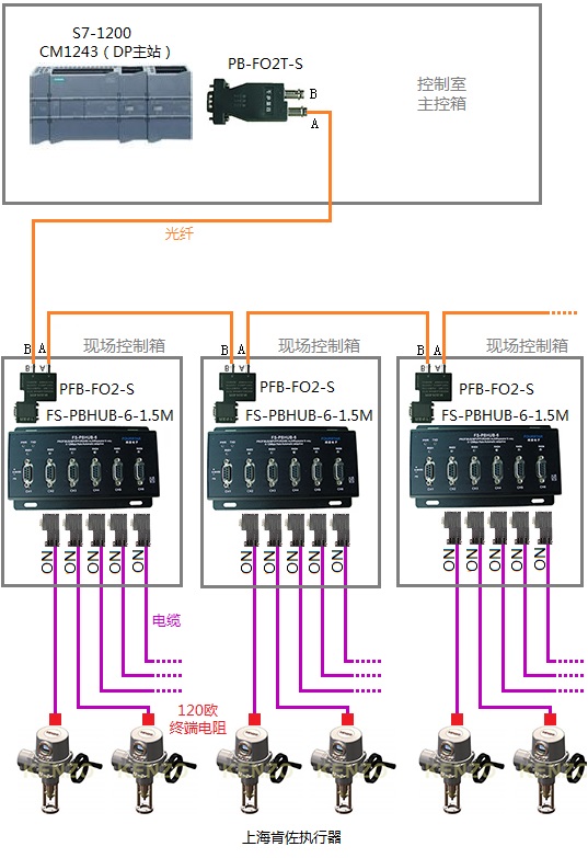 2、采用PROFIBUS集線器加光纖HUB的方案: