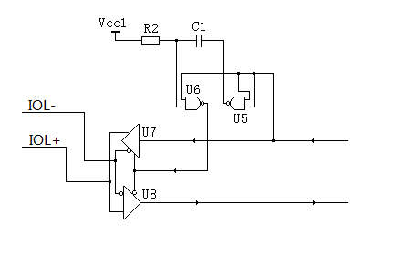 如圖2-3所示,由與非門U5、U6控制電路和U6、U7差分發(fā)送器和差分接收器完成將TTL電平轉(zhuǎn)換成差分信號(hào)傳輸,合理選擇R2和C1的參數(shù)使其適應(yīng)IO-Link的不同通訊速率COM1(4.8Kbps)、COM2(38.4Kbps)、COM3(230.4Kbps)。